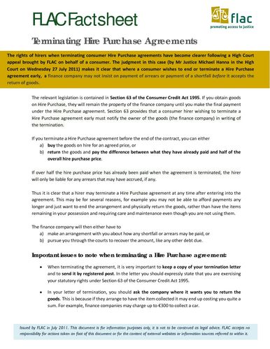 In July 2011 FLAC was behind the Gabriel case involving the Financial Services Ombudsman which clarified the law around terminating hire-purchase agreements and then issued a FLACsheet explaining the process for consumers.